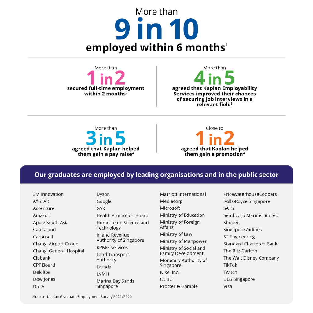 All statistics are based on the Kaplan Graduate Employment Survey 2021/2022 conducted by Nexus Link Pte Ltd for graduating cohorts between June 2021 – Feb 2022.